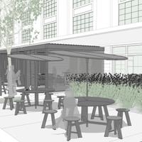 - Under the tree canopy, Harvest tables, Harvest benches, Harvest stools, and Disc umbrellas accommodate outside dining.