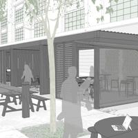 - Scenic structures form the core of this streetscape dining setting with a variety of seating and dining options both within the structures and along the street.