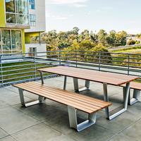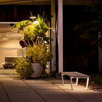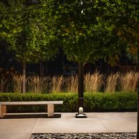 Un mélange de mobilier extérieur en béton et en bois Landscape Forms s'associe pour créer un environnement social magnifique et détendu pour les espaces extérieurs communs d'une propriété résidentielle.