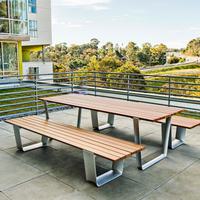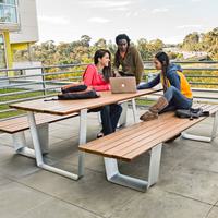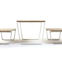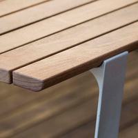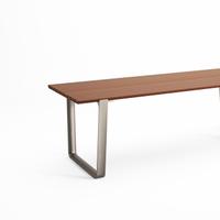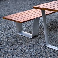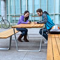 La généreuse table MultipliCITY reprend la forme sculpturale convexe du banc qui l'accompagne avec des variations d'angle et d'épaisseur pour assurer la stabilité. La table est de taille importante, avec de larges planches de bois qui offrent une douceur familière au toucher. Elle est adaptable et multifonctionnelle, conçue pour manger, travailler et se réunir.