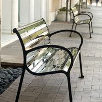 Scarborough est à la fois urbain et très sophistiqué. Il forme une courbe contrôlée avec l'assise et le dossier, puis tempère la retenue par l'exubérance de son accoudoir. Le banc disponible en deux versions est accueillant et confortable. Le siège à bride horizontale est épuré et simple, tandis que le siège tissé rappelle le tissu de sanglage familier du mobilier de terrasse.
